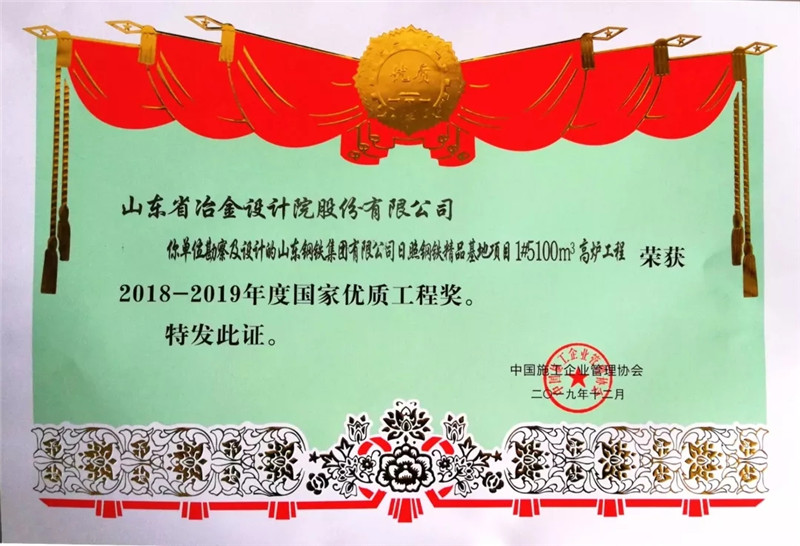 12月8日,2018-2019年度國家優(yōu)質(zhì)工程獎(jiǎng)總結(jié)表彰大會(huì)在國家會(huì)議中心舉行,由山冶設(shè)計(jì)總體規(guī)劃、自主設(shè)計(jì)并采取“EPC”總承包模式建成的山鋼集團(tuán)日照精品基地1#5100m3高爐工程喜獲國家優(yōu)質(zhì)工程獎(jiǎng)。