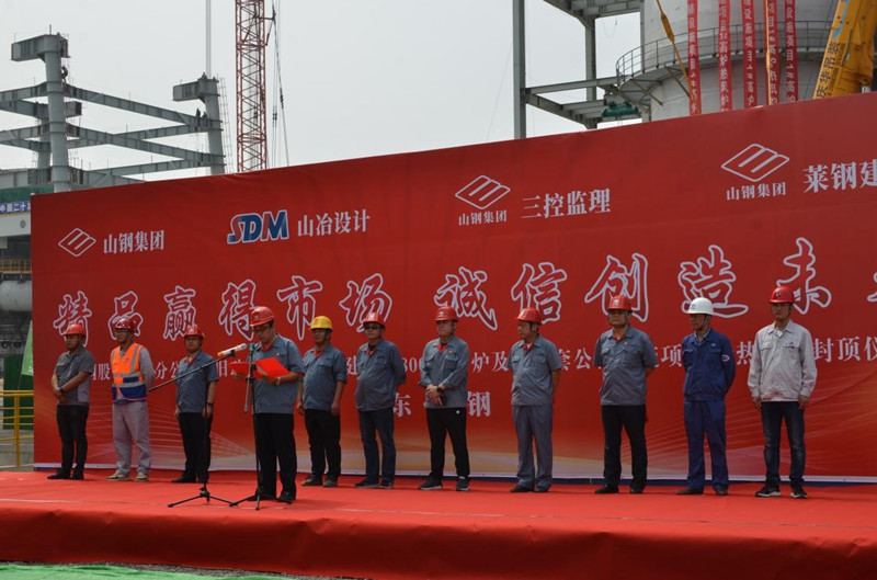 2020年6月28日9點50分,公司總包的山鋼股份萊蕪分公司新舊動能轉換項目1號3800m3高爐熱風爐順利封頂!山鋼股份萊蕪分公司新舊動能轉換項目工程指揮部副指揮孫建設,山鋼股份萊蕪分公司煉鐵廠經理、高爐工程項目經理部經理張明,新舊動能轉換項目工程指揮部高爐工程項目經理部常務副經理賈友劍,萊蕪三控冶金建設監理事務所經理沈桂聯,我公司黨委書記、副總經理谷卓奇,萊蕪鋼鐵集團建筑安裝工程有限公司黨委書記、董事長時元海,萊蕪鋼鐵集團建筑安裝工程有限公司副經理梁博,上海二十冶萊鋼高爐項目部項目經理李虎,中國十九冶萊鋼高爐公輔項目部項目副經理田澤龍,河北省安萊鋼高爐噴煤及鑄鐵機項目部項目經理王紅帥,中十冶萊鋼主控樓項目部項目經理馬少華出席了儀式。
