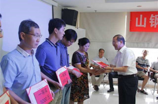 公司董事長魏新民、總經(jīng)理衣忠德給一等獎(jiǎng)?wù)撐淖髡哳C發(fā)榮譽(yù)證書及獎(jiǎng)勵(lì)。